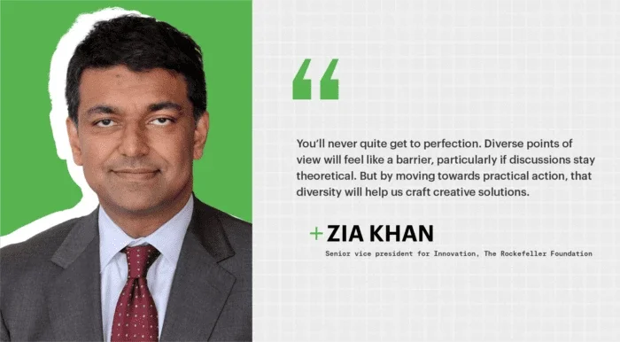 Zia Khan is the Chief Innovation Officer at The Rockefeller Foundation, which he joined in 2009. He currently leads the work on novel ideas, coalitions, and solutions. He previously led the Foundation’s program and strategy teams. Prior to joining the Foundation, Zia led the San Francisco office of Katzenbach Partners, a strategy consultancy. Zia serves as the Board Vice Chair for Stone Barns Center for Food & Agriculture and as a Board Director for Atlas AI, a company providing geospatial-based insights. Zia also serves on the advisory Boards for University College London’s Institute for Innovation and Public Purpose and Stanford Social Innovation Review Books.